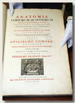 The volume is noteworthy inasmuch as Cowper, a great anatomist and surgeon in his own right, “borrowed” the majority of the plates from a 1685 edition of Govard Bidloo, a Dutch anatomist. Cowper did not give Bidloo proper credit for his involvement in this work, however, it may be argued that Cowper’s text was better!